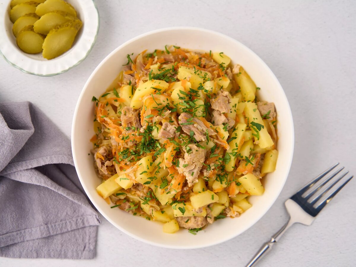 Классическое жаркое состоит из мяса, чаще всего свинины или говядины. Но если приготовить это блюдо с тушенкой, то получится экспресс-вариант, причем очень вкусный. Главное, взять качественную тушенку с натуральным составом, без загустителей. Ингредиенты: Приготовление: Подавайте жаркое с солеными огурчиками. Приятного аппетита!