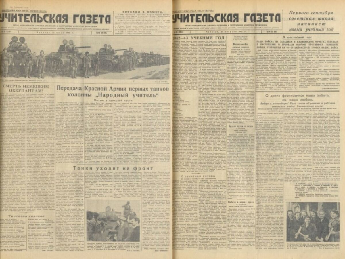 В январе 1942 года учителя 13-й школы г. Куйбышева выступили с почином построить танковую колонну «Народный учитель». Это предложение было сразу же поддержано газетой. «Пусть в рядах советских танков, беспощадно разящих врага, будут и наши танки, построенные на средства советских педагогов… Учителя и учительницы! Нашу танковую колонну “Народный учитель” должны строить все школы, все педагоги! Подхватывайте почин куйбышевцев!» – призывала «Учительская газета» 11 февраля 1942 года.
