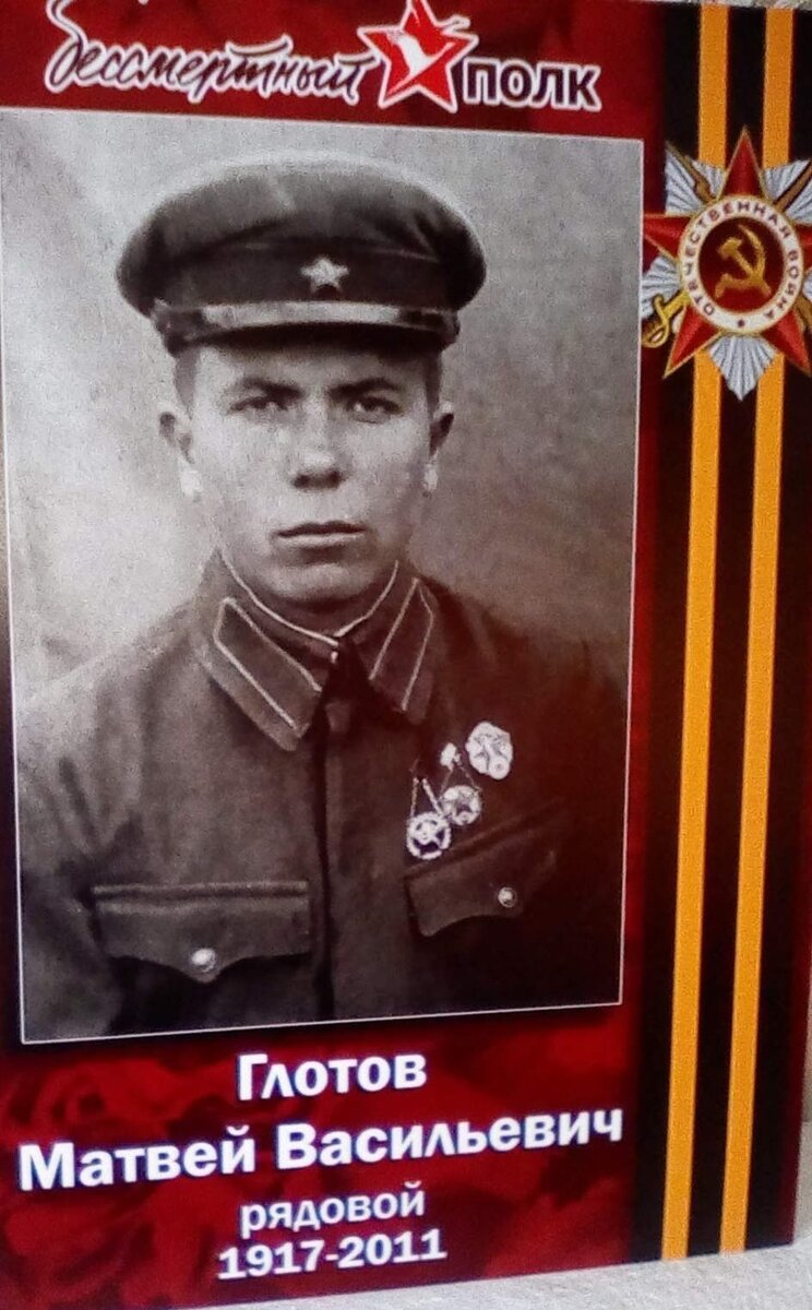 В Великой Отечественной войне у меня воевали оба деда. Папиного я совсем не помню. Видела его только на фотографиях . Когда мне было примерно 1,5 года он уехал на свою родину в Белоруссию ( не заладилось что-то у них в семейной жизни , бабушка об этом никогда не рассказывала ). Умер он в 80 м году, зашевелился осколок, это мне уже потом папа рассказал. Мы в это время жили в Монголии, поэтому папа даже не смог съездить к отцу на похороны. А вот маминого папу Матвея Васильевича я обожала, и он меня очень любил. Это был великий труженик, скромный, добрый, прекрасный отец и дед. Войну прошёл от начала и до концы, был 5 раз ранен, контужен, плохо слышал, пользовался слуховым аппаратом. С войны он вернулся в 1948 году, ещё 2,5 года после войны был на восстановлении ж/д путей и мостов. С бабушкой они поженились ещё до войны , в 1939 году. Дочка Раечка родилась уже после того , как дедушка ушёл на фронт, в 1941 году, но прожила совсем недолго, умерла совсем крошкой от воспаления лёгких... У