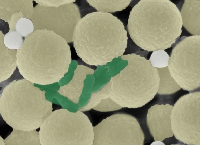 Фото: Американское химическое общество. Серо-желтые крупные шарики – роботы, зеленые – бактерии, светло-серые маленькие шарики – кусочки пластика Об опасности микропластика, в который превращаются пластиковые отходы, попадая сначала в воду, а потом, через пищевую цепочку, – в живую природу и в человека, знают все. Но проблема усугубляется тем, что микропластики привлекают бактерии, в том числе, болезнетворные, которые на этих пластиковых микрочастицах селятся. Последствия этого двойного попадания в организм человека до сих пор не изучены до конца. Именно поэтому так важно найти способы очищения воды от микропластика. Микророботы, созданные американскими учеными, представляют собой полимерные магнитные шарики: положительно заряженные полимеры соединены с магнитными микрочастицами; каждый робот – диаметром 2,8 микрометра. От поверхности шариков отходят полимерные нити, которые, под воздействием вращающегося магнитного поля, захватывают микропластик и бактерии. Микророботы не просто движу