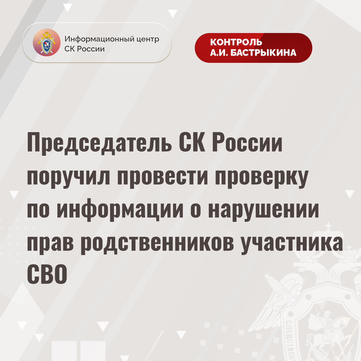 Председатель СК России поручил провести проверку по информации о нарушении прав родственников участника СВО