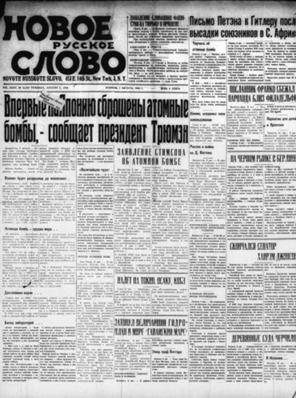 Мы продолжаем разбирать архивы газеты "Новое русское слово", напомню, что в печатном виде газета выходила 100 лет, до 2010 года. НРС - уникальное, старейшее в США издание на русском языке. Станьте частью истории - разместите статью о себе или своем бизнесе в нашем медиа. Статья выйдет без пометки "реклама", попадет в ТОП-Google и будет работать на вас долгие годы! Для заказа пишите WhatsApp/Telegram +19293275619 А пока представляю вашему вниманию заметку о бомбардировке Японии атомными бомбами (статья вышла 7 августа 1945 года) Вот её текст: Вашингтон, б августа. - Белый дом сегодня опубликовал сенсационнейшeе сообщение Трумэна о том, что американские летчики сбросили на японскую морскую базу Хиросиму груз атомных бомб. "Новая бомба", - гласит заявление президента, - "хотя и малых размеров, обладает взрывчатой силой в 2000 раз превышающей разрывную силу знаменитого английского "разрушителя кварталов". Эта бомба - атомная. Источник солнечной энергии сейчас направлен против тех, кто вовл