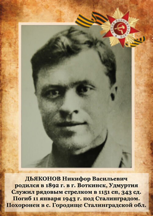 А превратились в белых журавлей... (Расул Гамзатов) Дьяконов Никифор Васильевич Мой прадед Дьяконов Никифор Васильевич до войны был директором в сельской школе в Воткинском районе Удмуртии. Служил там вместе со своей супругой, моей прабабушкой, которая преподавала детишкам начальных классов. Умный интеллигентный человек, уважаемый в селе. На войну был призван 25 мая 1942 год. Прослужил совсем немного. Погиб 11 января 1943-го под Сталинградом. Захоронен там же, в Сталинградской (ныне Волгоградской) области, в селе Городище. Петров Павел Николаевич О деде моего супруга Павле Николаевиче Петрове тоже известно совсем немного. Родился в 1913 году в деревне Урдумошур Дебёсского района Удмуртии. На фронт был призван в самом начале войны, с первым призывом – в июне 1941-го. Дома осталась жена и двое маленьких детей. Один сын 1938 года рождения – отец моего мужа, второму сыну – несколько месяцев. Па