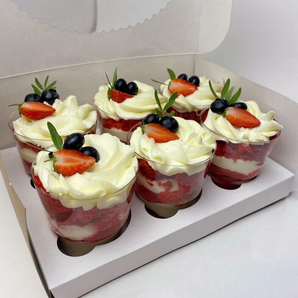 Десерты в стаканах - настоящее удовольствие для гурманов! Вот рецепт, который позволит приготовить около 10-12 порций этого великолепного лакомства. Для бисквита "Красный бархат" вам понадобятся: - 270 гр муки - 150 гр молока - 160 гр сахара - 2 яйца - 50 гр растительного масла - 1/2 ч.л. соды - щепотка соли - 8 гр какао-порошка - 100 гр сливочного масла (82,5%) - Краситель красный Для приготовления бисквита смешайте муку с содой и какао. Взбейте масло с сахаром, добавьте яйца, затем влейте молоко с растительным маслом, добавьте соль. Добавьте краситель и постепенно введите сухие ингредиенты. Перемешайте тесто и вылейте его в форму. Выпекайте при 180°C около 25-30 минут. После остывания нарежьте бисквит кубиками. Для крема-чиза с ванилью вам понадобятся: - 5-10 гр ванильной пасты - 400 гр творожного сыра - 50 гр сахарной пудры - 150 гр сливок (33-35%) Смешайте все ингредиенты в миксере до получения нежного крема. Переложите крем в кондитерский мешок. Для вишневого соуса: - 300 гр
