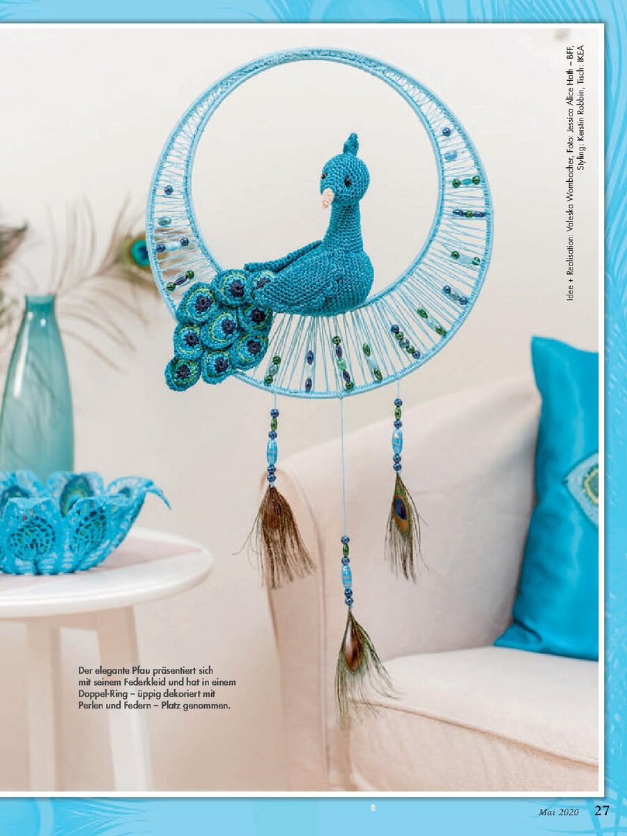 Размер: 40 х 40 см Каждый павлиний глаз обвязан вокруг бабушкиной каймы, а затем сшит вместе, образуя квадрат. Искусно связанный крючком чехол для ручки - прекрасное украшение и декоративная ваза на столе. Сиденье на стул Прихватка «Павлин» Размер: 20 х 20 см Модель Анны Кудряшовой Вам потребуется: пряжа «Народная» [30% шерсть, 70% акрил, 220 м/100 г) - 50 г зеленого цвета для основы, остатки более тонкой хлопковой пряжи фиолетового, голубого, желтого и зеленого цвета, крючок №3, маркер. Основа: наберите цепочку из воздушных петель длиной 20 см + 2 возд. п. подъема. Начиная с 3-й п. от крючка, вяжите ряд столбиками с/н. В конце выполните 2 возд. п. подъема на следующий ряд разверните работу и вяжите столбики с/н. Продолжайте вязать таким образом, пока в высоту не будет связано 20 см. Петля: прикрепите нить в уголк