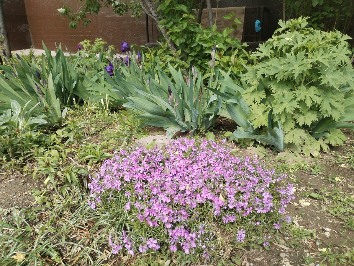 Напомню, что цветники мои находятся в тихом дворе у южной стены многоквартирного дома. Это их и спасает. Повсюду снег лежит, а в цветнике только капли влаги.