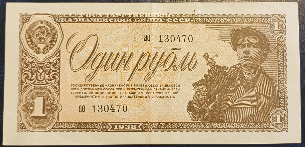 Рубль образца 1938 года пришел на смену рублям образца (дизайна) 1934 г. На лицевой стороне банкнот были изображены представители советского общества - рабочие и военные.