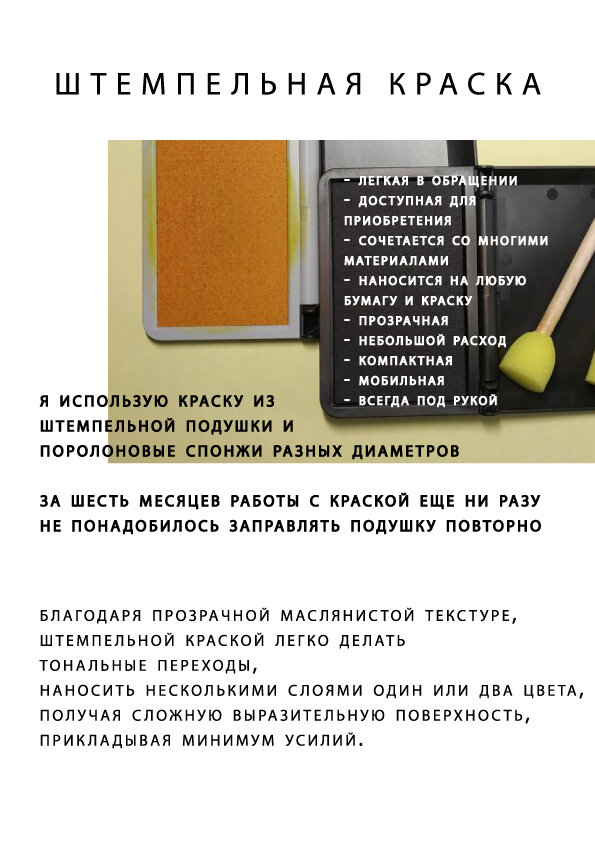 Для нанесения штемпельной краски использую поролоновые валики и спонжи различных диаметров и размеров, предварительно прокатывая их по штемпельной подушке.