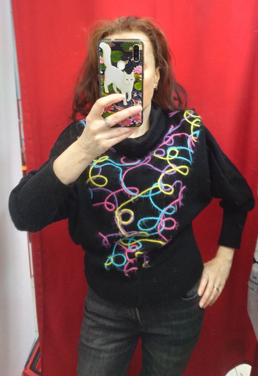 Здравствуйте. Вчера написали отзыв, что у меня на канале "реклама бушной вражеской одежды")). Я поинтересовалась, а как она пользуется вражеским интернетом? Ничего не смущает? Судя по такой логике у меня еще вражеская кошка-британка. И я не знаю, чем она занимается ночами, может вредит потихоньку. А еще стоит присмотреться к филиппинскому клеродендруму, мадагаскарскому жасмину и амазонской лилии? А то я их поливаю, ращу, а они тоже с вражеской стороны? Провентилировать этот вопрос надо. Хотя страшнее глупости врага нет. 490 за кг и в этот раз не очень мне понравился выбор, бывало получше и поинтересней. Джемпер без бренда и без состава. Широкие резинки на рукавах и на бёдрах, воротник-хомутик, но очень он маленький и аккуратный. Пожалуй померила больше из-за отделки, из-за такого разноцветного серпантина. Кардиган с капюшоном и карманами, длинный, мне почти до коленей, мерзлявому человеку закутаться в самый раз. Я бы рассматривала как вариант для дома или на дачу. Получается, что я