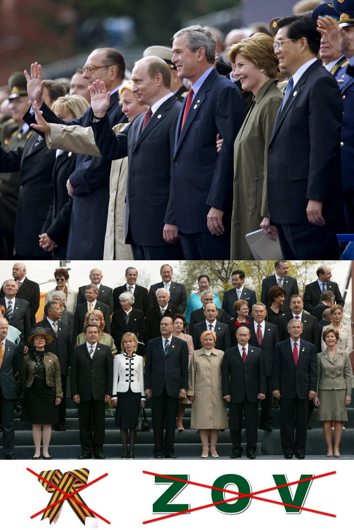 Историческое фото в День Победы, 9 мая 2005 года. Путин, Буш, Ширак и другие мировые лидеры. До того, как в России были изобретены символы нового режима.