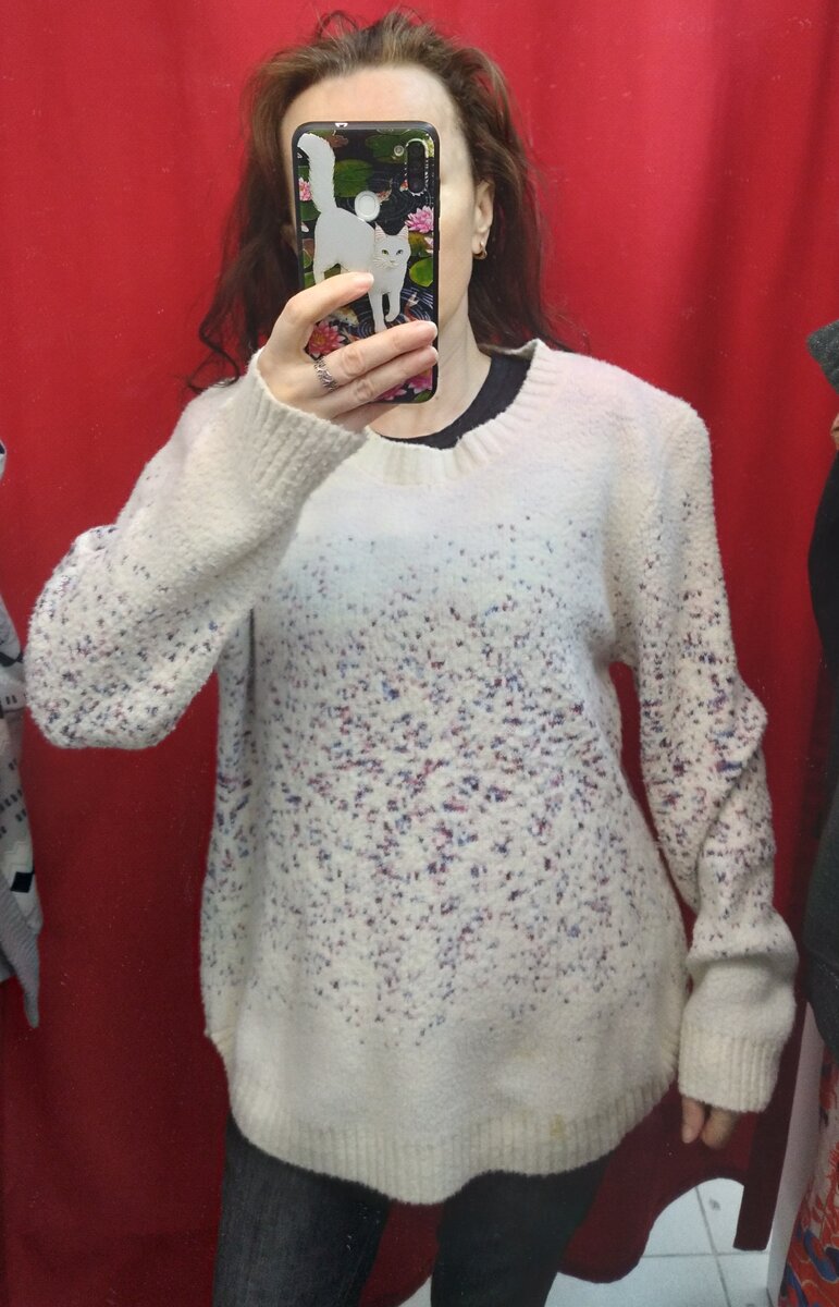 Здравствуйте. Продолжу обзор со скидки и цена 490 за кг. Джемпер моего размера, но почему-то большой. Трикотаж как бы забрызган краской и трикотаж такой.. с проплешинами)), где ворс курчавится, а где его нет. Темно-серый худи с капюшоном. Сел на мне неплохо, но ткань с добавлением люрекса оказалась для меня кусачей. И название странное, покупать не знамо что я не буду. Cavalluna - европейское развлекательное шоу с участием лошадей, основанное в 2002 году. Верховая езда, танцы, музыка и театр объединены в единое целое, предназначенное для всех возрастов, особенно для семей с детьми. Свитшот яркого песочного цвета с одиноким скромным одуванчиком. И хороший совет " просто дышать", надо же иногда перестать париться и напрягаться иногда надо просто дышать. ))) Свитшот-райский сад или роскошная клумба. Цветов много, но все цвета неярких оттенков)). Спинка однотонная. Теплая светло-голубая толстовка, ткань очень толстая, а капюшон ещё и с мехом. Было неплохо если мех был бы везде)). Ведь