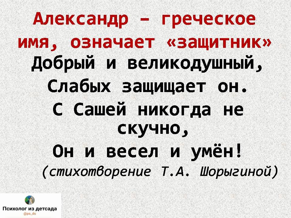 Имя Александр происходит от древнегреческого слова означающего «защитник» Люди с этим именем обладают сильным духом и стремятся помогать другим. Они общительны, умеют договариваться в общих интересах.