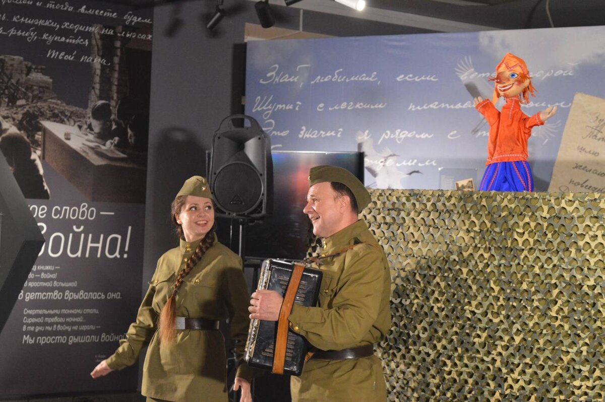В четверг, 9 мая, в Музее обороны Тулы в кинотеатре имени Бабякина все желающие смогли посмотреть спектакль артистов Тульского театра кукол «Петрушка на войне». Постановка рассказывает о веселом и задорном бойце Петрушке – любимом народном герое, известным тем, что благодаря своей смекалке он выходит из любых передряг. Впервые спектакль о Петрушке показали в 1941 году артисты Московского театра кукол, ушедшие на фронт в составе ополчения. «Это яркий, смешной, сатирический спектакль, поставленный в форме площадного балаганного театра, где главный герой – боец Петрушка, борется против Гитлера и его генералов дубинкой и смекалкой. А помогает ему разбитная и смелая подружка Марфушка. При помощи отваги, юмора, шуток-прибауток, частушек и забавных присказок, Петрушка с Марфушкой побеждают немецкую армию. В основе спектакля – реальные тексты интермедий, с которыми артисты-кукольники выступали на фронте. Веселый, никогда не унывающий Петрушка, вселял в бойцов уверенность в победе и дарил силу