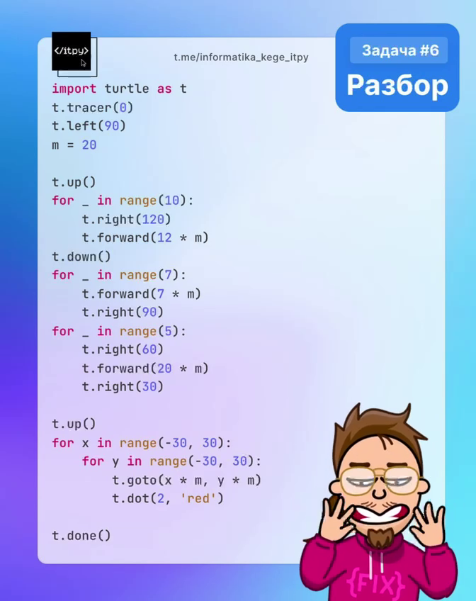 Повтори 6 [Вперед 20 Вправо 90] Сколько точек с целочисленными координатами находится внутри области объединения полученных контуров? Точки на линиях контуров учитывать не следует. Решение через Python и комментарии к нему: Комментарии к коду решения: Считаем точки в пересечении двух фигур: Ответ: 11 Читайте нас в телеграмме: Информатика ЕГЭ | itpy 👨💻