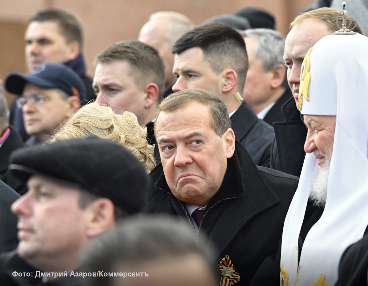 «Потерял ботинок, но не строй: Кто-то из участников Парада остался на Красной площади без обуви, но не остановился» - умиляются пропагандисты. А почему вы решили, что ботинок потерял кто-то из участников парада? Как может наш российский военный потерять обувь? Это, знаете ли, пропагандисты, при нынешнем сложном положении дел в стране может быть сочтено компетентными ведомствами за «дискредитацию армии». Пока не доказано – не высказывайтесь. Отчего бы не предположить, что ботинок потерян кем-то из влиятельных зрителей парада? Скажем, решил кто-то из них повторить чеканный шаг на трибунах, а ботинок с его ноги от восторга сорвался и описав кривую, со стуком рухнул на мостовую, приняв участие в параде застывшим артефактом. Да, и кто же это мог быть? Мы знаем только одного подходящего кандидата – это Медведев. И посмотрите, какое у него на параде сегодня было лицо. В Москве холодно. Разутая нога, быть может, замерзла. А Патриарх рядом смеётся, бессердечный. Дмитрий Анатольевич на параде 9
