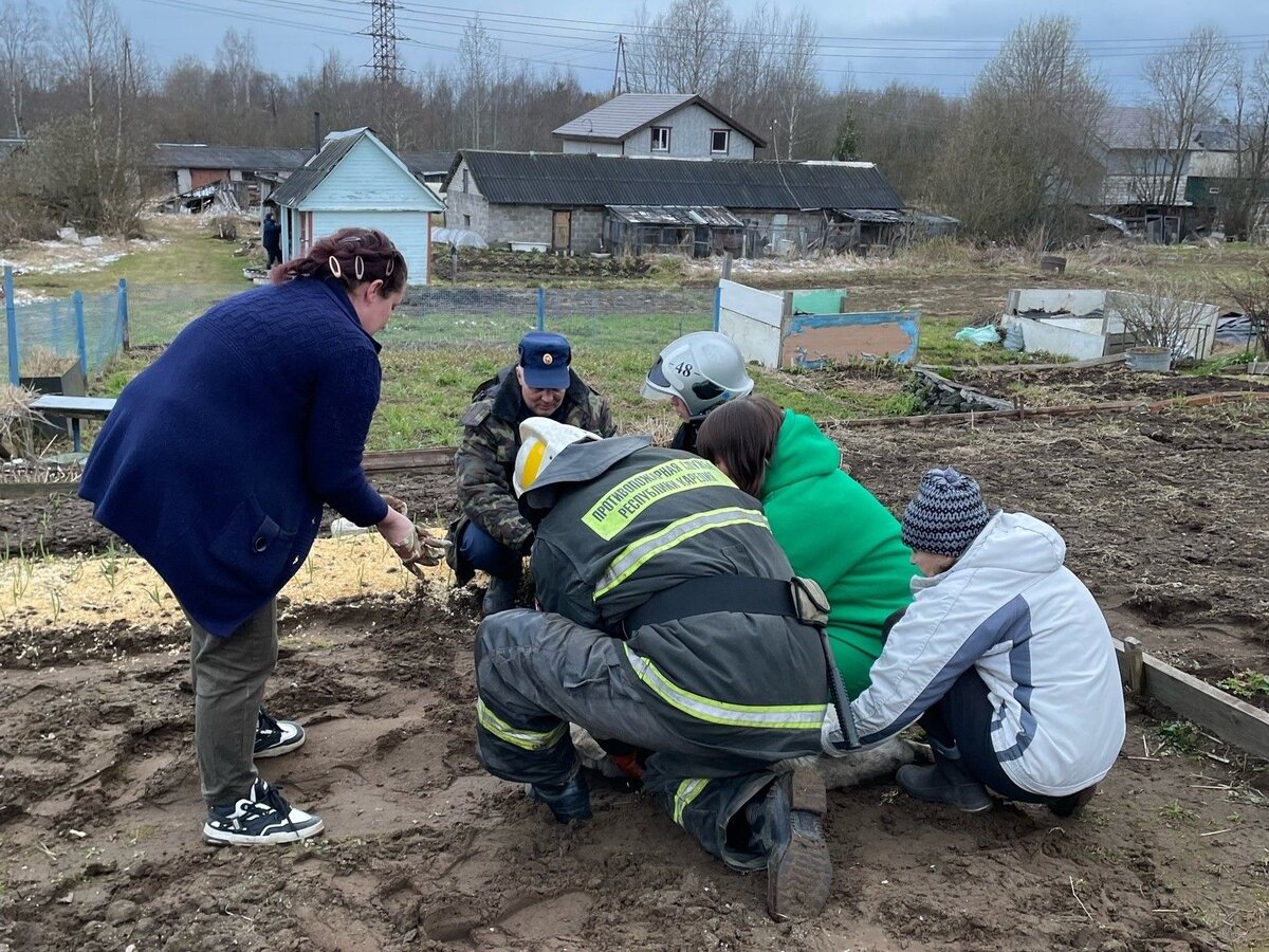 Собаке потребовалась помощь, животное запуталось в собственном поводке. Историю спасения рассказали в паблике Пряжа – самый тёплый поселок. Мы услышали, что где-то сильно скулит собака. Осмотрев округу, не увидели ничего подозрительного, но управдом рассказала, что за нашим домом лежит и скулит собака. Мы с мамой сразу побежали искать ее. Оказалось, что она запуталась в своем же ошейнике. Собака не могла стоять, передвигаться, нормально дышать и очень скулила! Люди обратились в МЧС, также написали об инциденте в соцсети. Откликнулись сотрудники Пожарной части 48 Пряжа, приехали и обычные жители. Общими усилиями они освободили пса. Разрезали ошейник, освободили язык от карабина и сняли кольцо от цепи с лапы бедного животного.