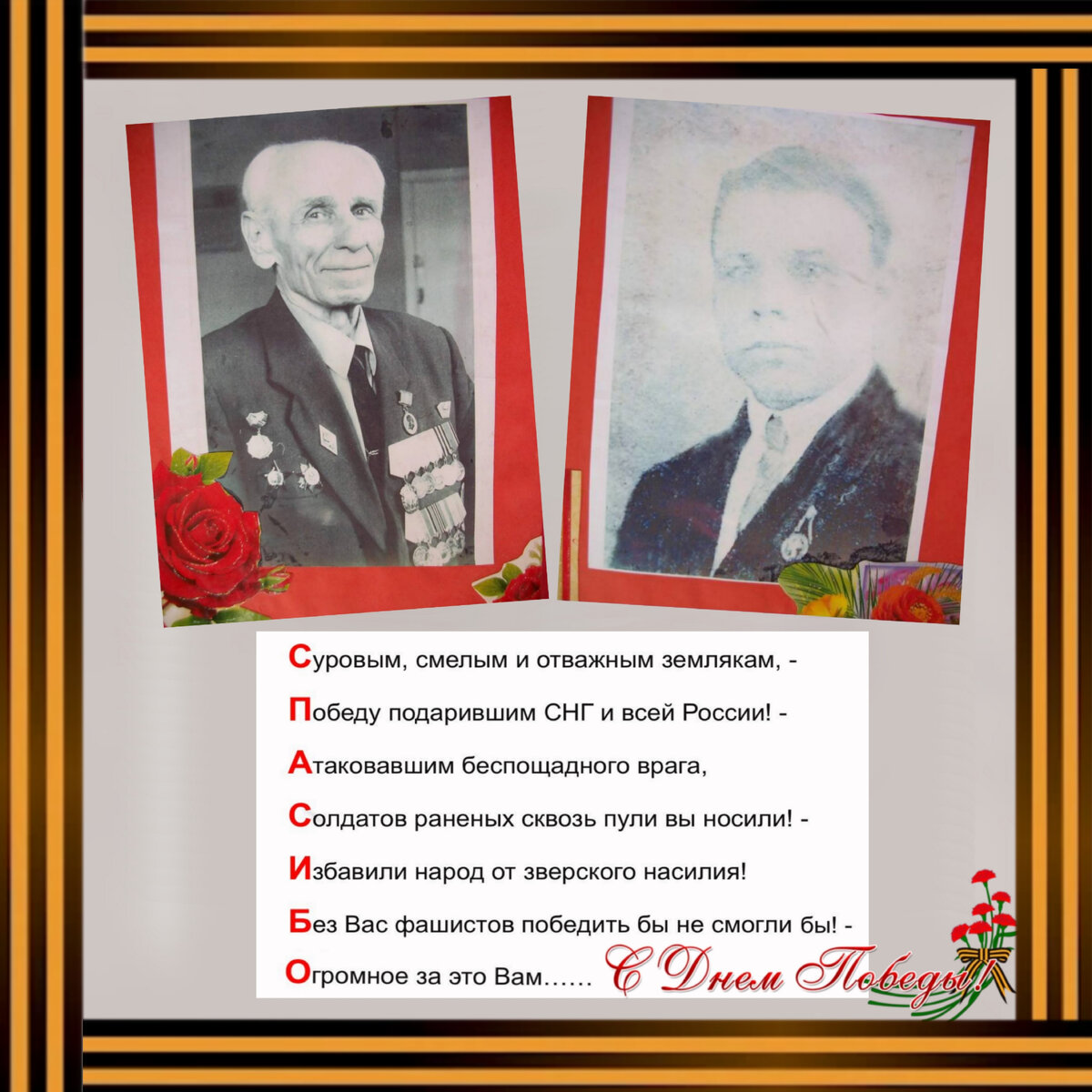 Суровым, смелым и отважным землякам, - Победу подарившим братским странам и самой России! - Атаковавшим беспощадного врага, Солдатов раненых сквозь пули вы носили! - Избавили народ от зверского насилия! Без Вас фашистов победить бы не смогли бы! - Огромное за это Вам…… (посмотрите первые буквы каждой строчки, прочтя по-вертикали) На фото , мои прадедушки Алексей Мефодьевич Жуков в 1941 году пропал без вести И прадедушка Пётр Антонович - майор, кавалер трех орнденов. Фото прислала мама, спасибо, что она смогла это сделать, а то она совсем далека от техники. Кстати, этот тоже один из моих ранних стихов и он тоже уже давно гуляет по интернету. Но здесь мне людям предъявить нечего, так как он был опубликован мною на сайте стихов под псевдонимом. Пусть уже гуляет, прославляя Великую Победу. Тем более, что его в плане урока о Дне Победе опубликовали) ) ) Всех с праздником! Мира и всех благ! #акростих #стихи #поэзия #стих #рифма #деньпобеды #праздник #спасибо