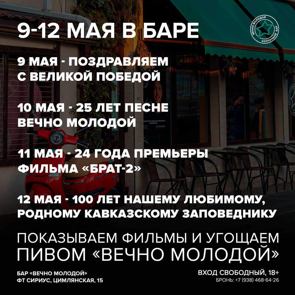 10 мая. 25 лет песне Вечно Молодой. В этот день Сергей Бобунец и группа «Смысловые Галлюцинации» записали на Екатеринбургской студии «AV Music» песню, ставшую гимном поколения. В честь праздника угощаем пивом «Вечно Молодой».