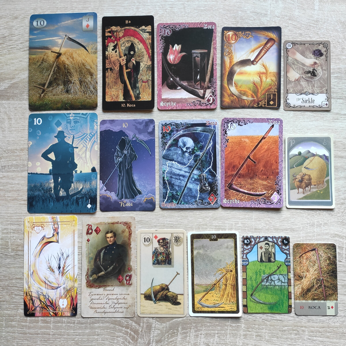 📜Карта Коса 🔮Оракул Ленорман 10. карта Ленорман в классическом исполнении. На картах изображена уже законченная работа. Рожь уже скошена и стоит в снопах, поэтому эта карта может показывать - усталость или момент завершения чего-то. 📜Чем эти карты отличаются друг от друга?! Рассмотрим! 📌На первой карте Лезвие Косы направлено вниз, а это значит пришло время завершения. И если рассмотреть на карте поле, то одно скошенное, а за ним виднеется зелёное. А это значит эта карта может показать тот самый переход между завершением и началом. 📌А вот вторая карта более опасностей чем первая. Лезвие Косы направлена вверх, поэтому карта предупреждающая. У меня складываются такие чувства глядя на эту карту, как вариант того, что можно совершить ошибку. Ведь сами снопы выглядят как старые (увядшие), словно были собраны без надобности. Сюда можно отнести тот случай когда скосил, а потом подумал "Мне это не нужно!" Я бы ещё подумала...Куда правильно смотреть рядом стоящую карту или сверху лежавш