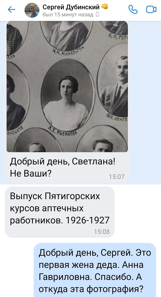 Сегодня неожиданно мне пришло письмо вКонтакте. Написал его один из активных участников группы "Пятигорск - Легенды Старого Города", кладезь информации, Сергей Дубинский - благодаря ему мы постоянно можем читать очень интересные статьи по Пятигорску светскому и церковному прошлого и позапрошлого веков , и о его жителях, ведущий рубрики #ИронияСудьбы, делящийся открытками и заметками из газет ... И вот сегодня Сергей присылает мне часть фотографии (он знает, что я ищу всех Рысаковых в Пятигорске ) Оказалось, что эта фотография выпускного курса аптечных работников 1926-1927 года из фондов Пятигорского музея! (А в музее говорят, что нет у них ничего с фамилией Рысаков) Теперь у меня есть фотография первой жены деда А я все никак не могу узнать дату развода деда с Анной Гавриловной, ну и, конечно, никогда не узнаю причину развода. Нельзя сказать, что эта находка мне очень полезна - если только для порядка ее в родословное древо добавить. Для отчётности . Ну и просто интересно же п