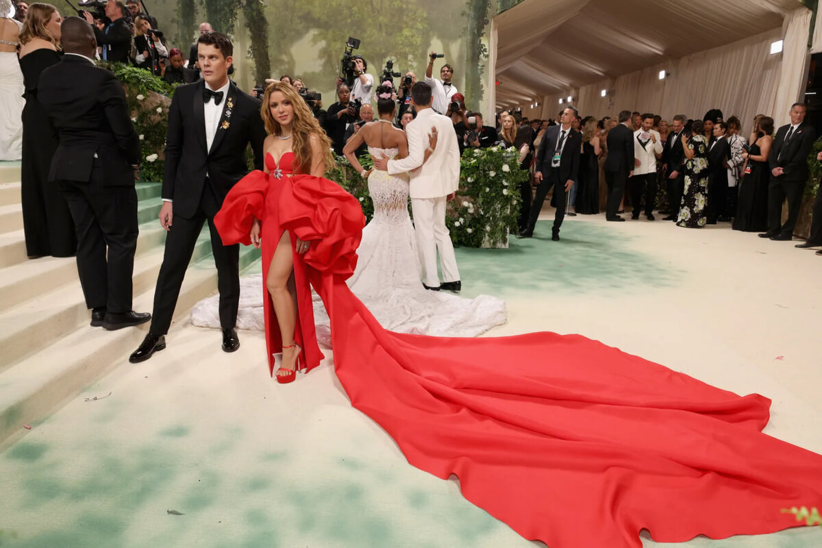 У Миры Мурати красный будто подчеркивает сочный оттенок лепестков. Образ Шакиры чуть меньше приближен к тематике бала, но обратите внимание на вырезы у платья ниже груди: об этом поговорим немного позже.