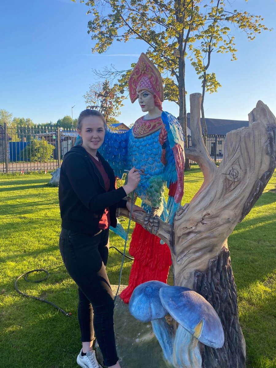 Анна - технолог пищевого производства. На фабрике участвует в создании рецептур мармелада и зефира. А после работы - свободный художник! Обновляет и восстанавливает деревянные скульптуры в парке. Сегодня ее творческая энергия выбрала птицу Алконост.