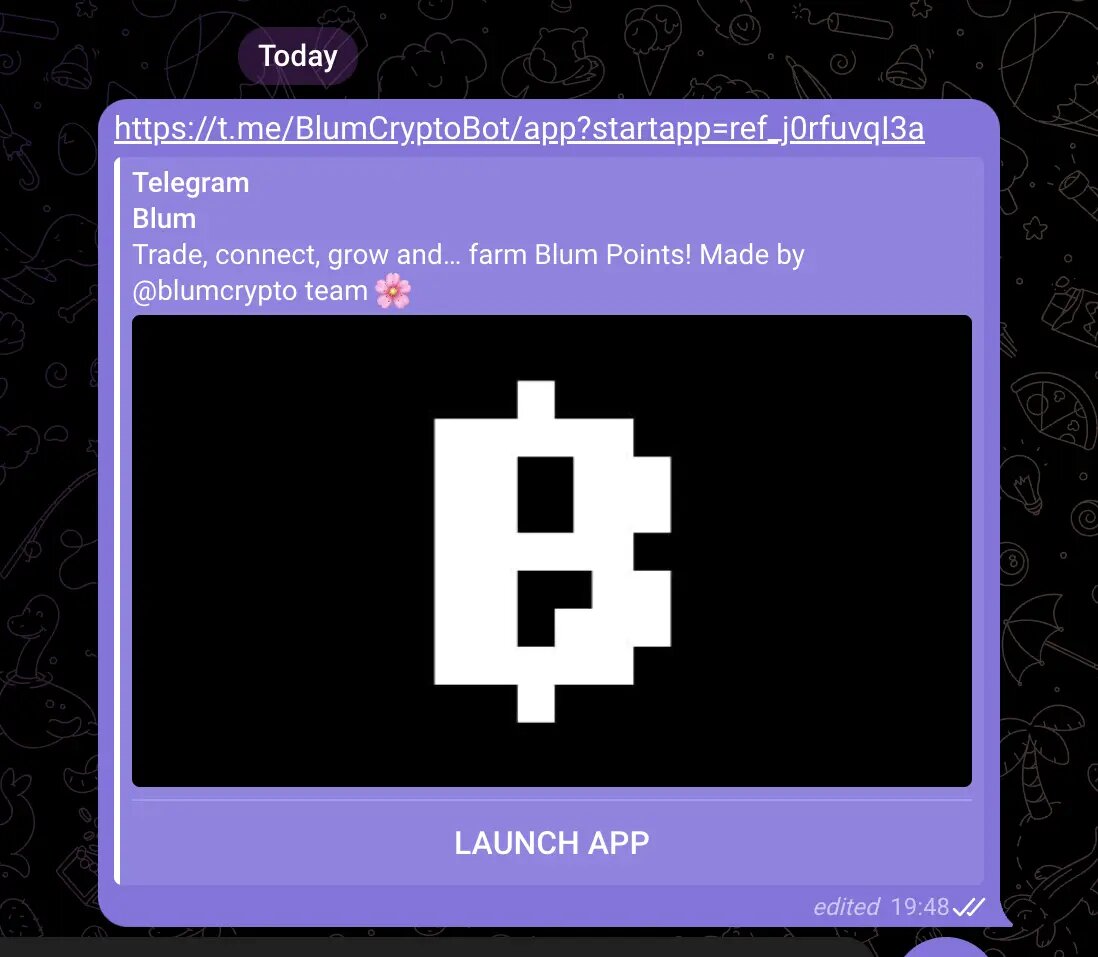 Описание проекта: Blum — это децентрализованная биржа, которая выходит за рамки типичной модели DEX, интегрируя функции как централизованных, так и децентрализованных платформ, решая общие проблемы, с которыми сталкиваются пользователи обоих типов бирж. Сайт проекта Twitter проекта Начнем прохождение тестнета 1.Сначала получаем пригасительную ссылку и запускаем приложение 2. Регистрируем аккаунт 3. Начинаем фарминг 4. Приглашаем друзей За каждого приведенного в приложение друга мы будем получать 10% от его дохода, и дополнительные алмазы для ежедневной тап игры Готово, благодарим за внимание и терпение, всем крипторезультат. Все обновления по проектам, быстрые смарт темы и приватная информация в нашем тг канале. Подпишись, чтобы не ловить фомо » Telegram 🔗