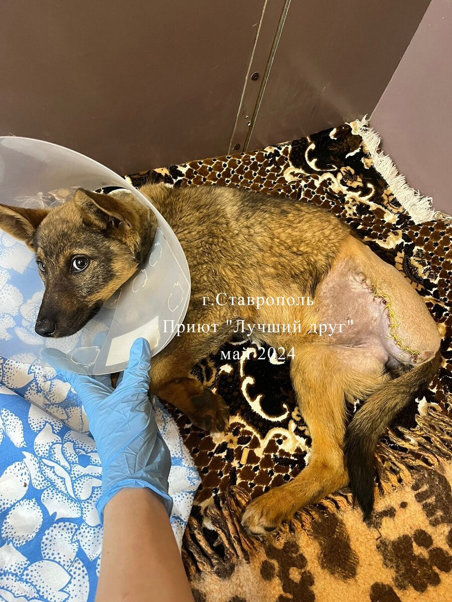 Через несколько дней щенка доставили в Ветцентр на Серова. Открытый перелом, некроз, нагноение, лапу нужно ампутировать, спасать ее уже поздно. Щенок ослаблен, сразу оперировать нельзя было, операционный наркоз не перенесет, сначала стабилизировали ее состояние. Ксана осталась на стационаре, вечером ей возили донора для переливания крови, а через несколько дней взяли в операцию.