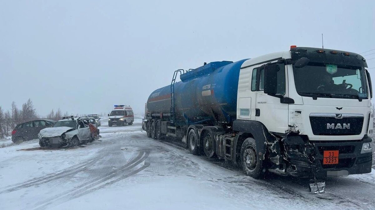 Три человека пострадали в массовом ДТП на заснеженной трассе Сургут — Салехард. Фото