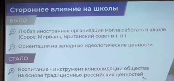 - Девяностые годы, когда много было так называемых экспертов в сфере образования и Сорос, и Мирбанк и так далее сегодня, та нормативная база, которая сформирована уже, она позволяет принимать решения только в интересах нашей страны, нашего государства.