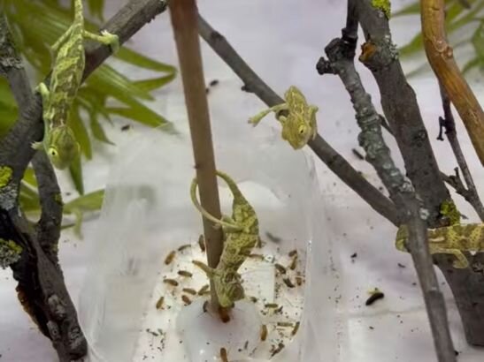 У всех хамелеонов индивидуальный организм и свой характер, несмотря на то, что они еще совсем крохи. Малыши пьют много воды, поэтому террариум, где они содержатся, опрыскивают несколько раз в сутки. Кормят их мелкими туркменскими тараканами и сверчками два раза в день.