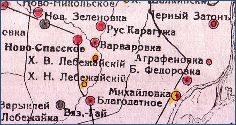 В бескрайних полях северной части Хвалынского района, неподалеку от речки Терешка, заросшей сорными деревьями американского клена, когда-то находился целый рой небольших хуторов, сел и деревень: села Ново-Спасское и Благодатное, деревни Вязовый Гай, Ново-Александровка, Русская Карагужа, Ново-Никольское, Варваровка, Ново-Зеленовка, хутора Илюшкин, Шалкинский, Верхне-Лебежайский, Нижне-Лебежайский.