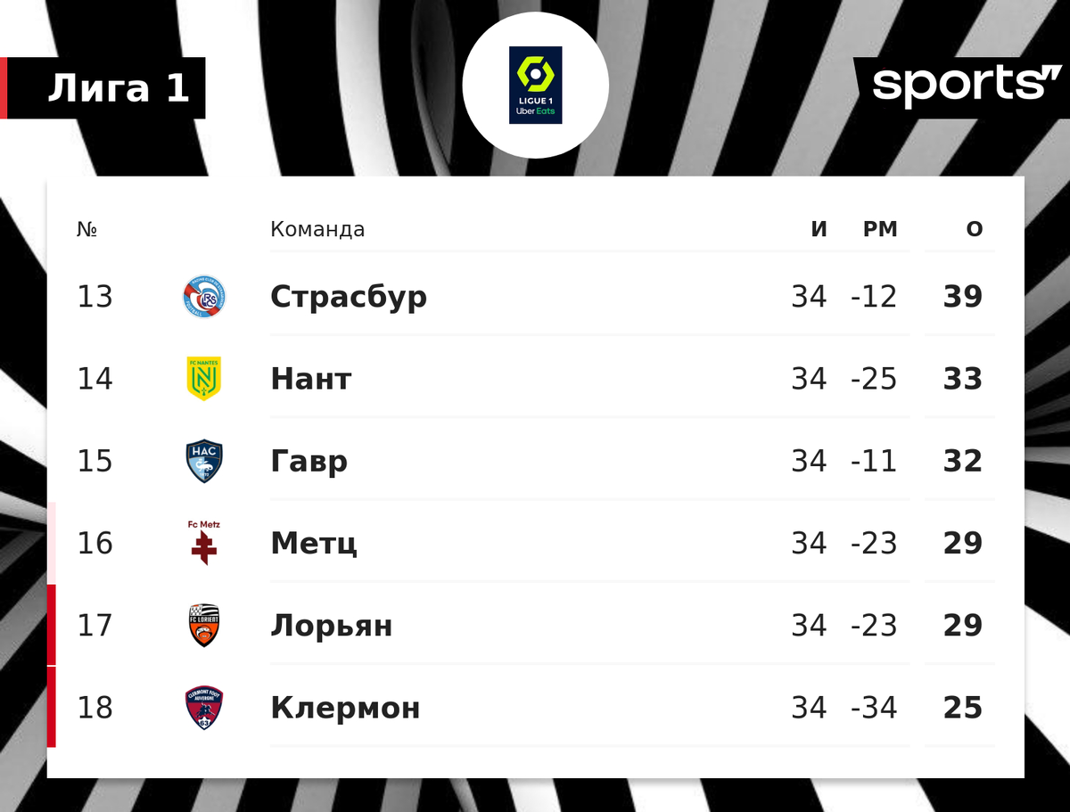 15-е место – прямо над стыками и зоной вылета. «Гавр» официально сохранился в Лиге 1 только по итогам последнего тура, до него еще оставались математические шансы рухнуть в стыки.