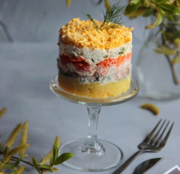 Сегодня я готовлю один из любимых своих салатов — «Мимоза». Вариантов его приготовления и способов подачи великое множество. Его готовят с сайрой, тунцом, слабосоленой семгой или форелью… и даже с копченой рыбой. И подают в салатницах, в виде рулетов и тортов. Неизменным остается одно — это послойный салат. Итак, «Мимоза» с тунцом! Я приготовила его в съемной форме. Время приготовления, с учетом варки овощей: 1 час. Ингредиенты Приготовление Все гениальное — просто: разминаю вилкой тунец, предварительно слив лишнее масло или жидкость. Отвариваю овощи и яйца. Очищаю. Морковь, картофель натираю на мелкой терке. Отделяю белки от желтков и натираю на мелкой терке. Зелень мелко нарезаю. Выкладываю слои: Картофель я всегда выкладываю первым слоем, чтобы сок или маслице с тунца пропитали его своим соком. Салат готов! Оставляю его на несколько часов в холодильнике, чтобы пропитался, и подаю к столу. Приятного аппетита!