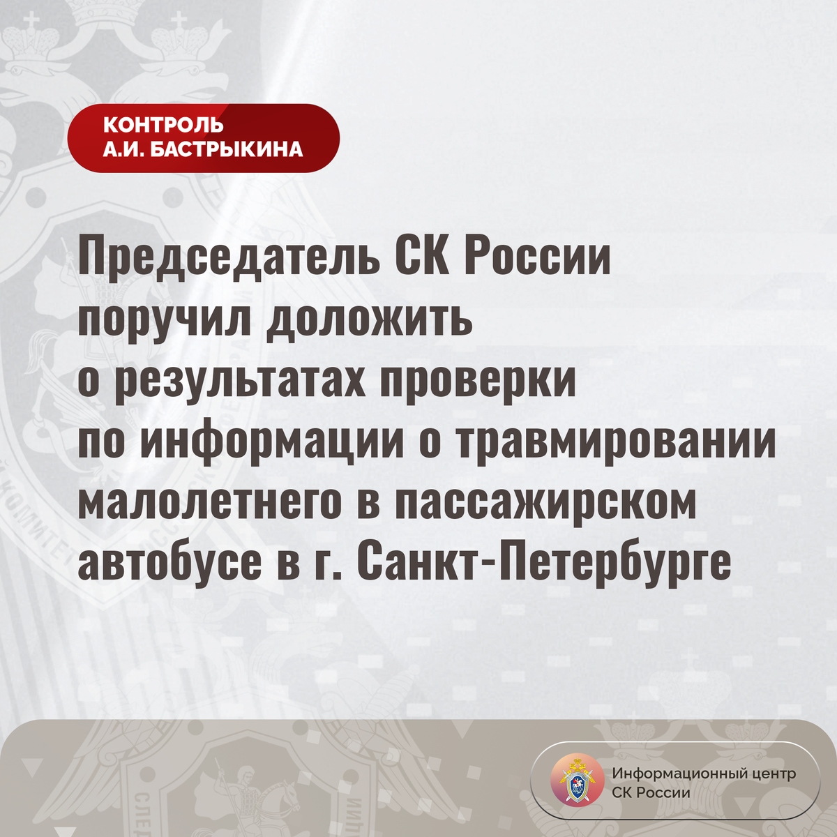 #СледственныйКомитет #СКРоссии #СКР #ИЦСКР #Информационныйцентр #АлександрБастрыкин #ПредседательСКР #КонтрольПредседателяСКР #КомментарийКонтроль #СанктПетербург