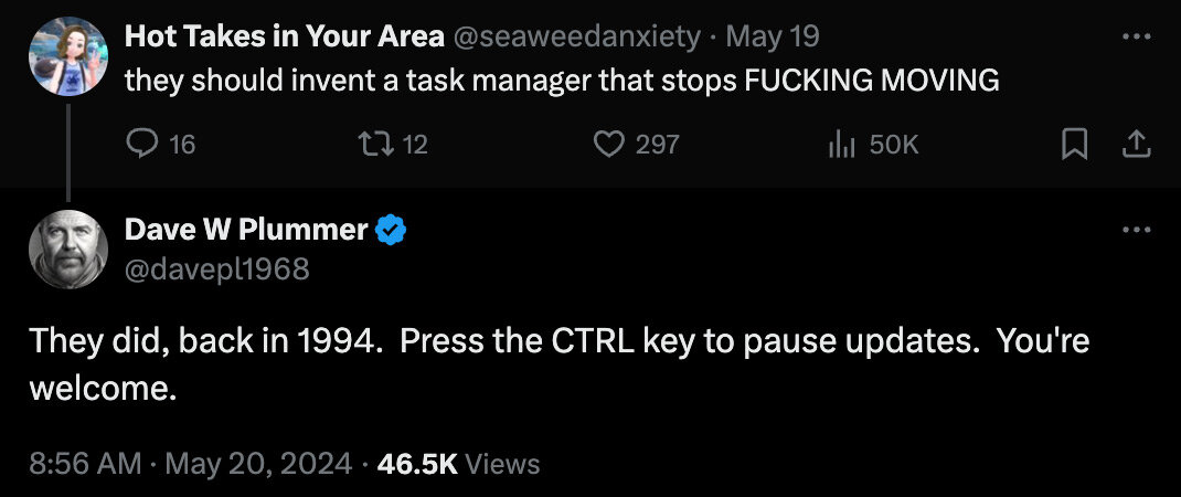 Пользователь ПК, раздраженный "прыгающим" Диспетчером задач Windows узнал, как зафиксировать строки с помощью одной кнопки — от разработчика, написавшего его 30 лет назад