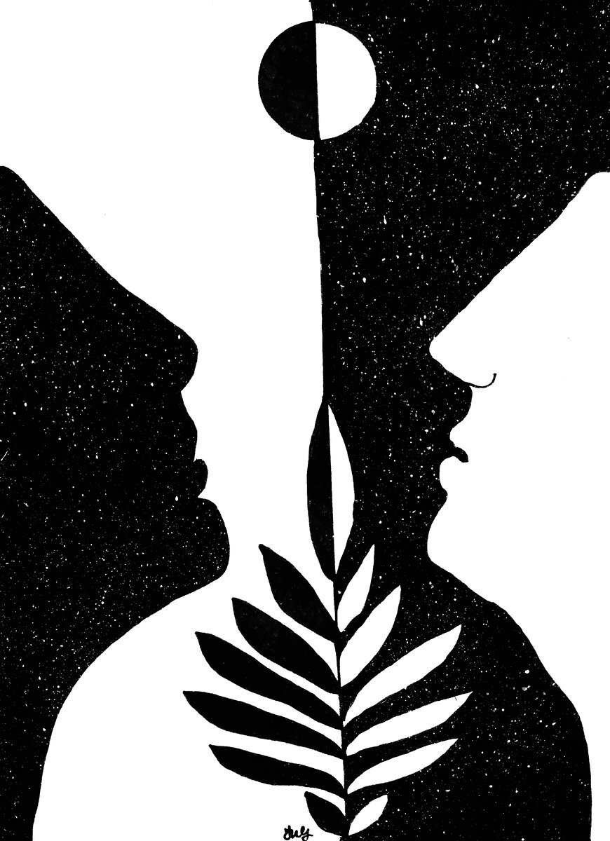 Я Люблю и Ненавижу тебя Два силуэта, мужской и женский, они оба я и они оба противоположны одновременно. Наверно потому что в каждом из нас есть мужское и женское начало, но вопрос лишь в том, что в нас больше. Ещё это про любовь и ненависть, про оба этих сильных чувства, которые льются через край. И они имеют полноценное право на существование, ведь они составляют нас самих. Да, оба этих чувства очень сильные и они не исключают друг друга, хотя соглашусь ненависть похожа на язву, разъедающую изнутри. Но в моей иллюстрации она в гармонии с любовью. И любовь здесь не простая, не привязанная к какому-то конкретному образу. Смотря на эту работу я хочу оставить больше загадок, не давать никаких конкретных ответов. А просто предложить вам прочесть эту работу по-своему, но главное не забывать, что все же это абстрактные образы мужского и женского и они оба отвечают на эти два чувства любовь и ненависть. А растение это плод чувств, оно стоит посередине, как бы уравновешивая их.