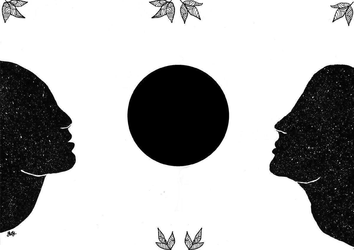 Чёрное солнце Два силуэта, которые сплетаются в один. Это про так, как враги становятся друзьями, про длительное противостояние, которое спустя время примерило их. Судьба обошлась с каждым из них жестоко и сделало их такими, но в один момент всё меняется. Меняется по прошествии времени и теперь уже следа от вражды не осталось ничего, и им кажется выгодным стать союзниками. Стать союзниками, чтобы противостоять тому, что уготовила судьбу отдельно для каждого из них. Какие это будут испытания? Смогут ли они преодолеть? Оставлю так же за кадром, и снова хочу оставить множество вопросов, не давая никаких ответов. Это очень спорная и личная работа, вдохновленная песней In This Moment —Promise. И хотя суть песни в обещании друг друга отомстить, что было также в начале когда я рисовала её. Рисовать под песни или делать отсылки на них я начала не так давно, и так уж вышло, что именно музыка помогает рисовать. Она мой главный вдохновитель.