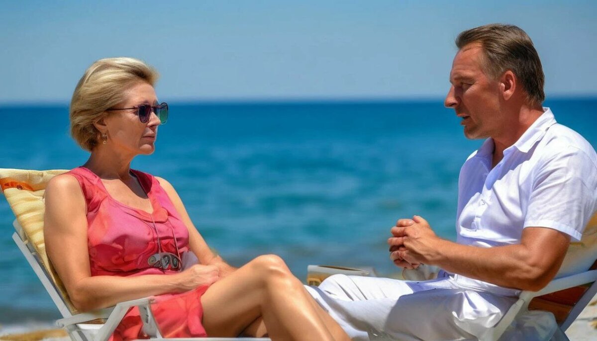Дарья и Олюшка плескались в воде, смеясь и веселясь. Мария сидела на шезлонге, наблюдая за ними с улыбкой. В этот момент она почувствовала, как кто-то рядом поставил зонтик, создавая тень на её шезлонге.