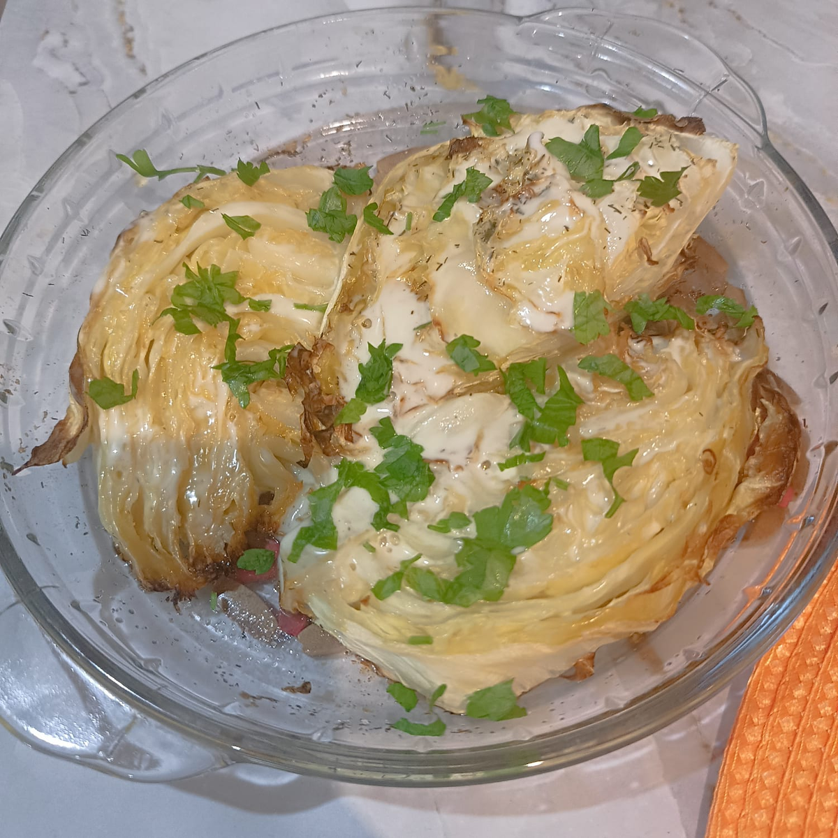 Я показывала уже стейки из молодой капусты на сковороде, можно и в духовке. Для этого нужно небольшой кочан капусты, весом около 1 кг, разрезать на 8 частей так, чтобы на каждом осталась кочерыжка. Стейки будут держаться на ней. Сначала на 2 части, затем каждую ещё пополам и ещё раз ) 1 небольшой кочан молодой капусты