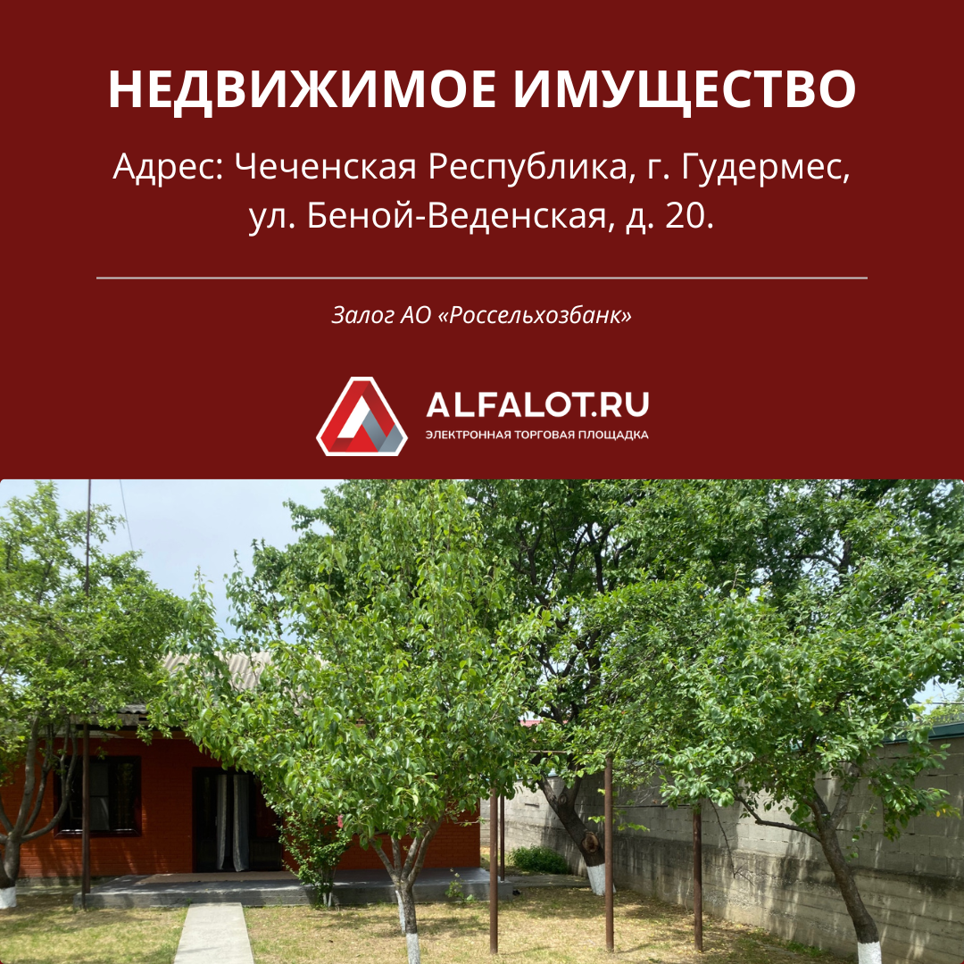 В форме аукциона на повышение продается жилой дом с земельным участком в Республике Чечня. Состав торгов: 1. Жилой дом: 2. Земельный участок: Адрес: Чеченская Республика, г. Гудермес, ул. Беной-Веденская, д. 20. Начальная стоимость - 3 600 000 ₽ ТОРГИ: ССЫЛКА НА ТОРГИ