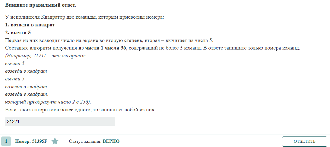 У исполнителя Квадратор две команды, которым присвоены номера: 1. возведи в квадрат 2. вычти 5 Первая из них возводит число на экране во вторую степень, вторая –– вычитает из числа 5. Составьте алгоритм получения из числа 1 числа 36, содержащий не более 5 команд. В ответе запишите только номера команд. (Например, 21211 – это алгоритм: вычти 5 возведи в квадрат вычти 5 возведи в квадрат возведи в квадрат, который преобразует число 2 в 256). Если таких алгоритмов более одного, то запишите любой из них. РЕШЕНИЕ Будем идти от числа 36 к числу 1 применяя противоположные команды, так мы будем видеть когда из промежуточного результата можно извлечь квадратный корень. Тогда мы имеем команды: 1. Извлеки квадратный корень 2. Прибавь 5 1) 36, квадратный корень извлекается: √36=6 Команда 1 2) 6 - нельзя извлечь квадратный корень, прибавим: 6 + 5 = 11 Команда 2 3) 11 - нельзя извлечь квадратный корень, прибавим: 11 + 5 = 16 Команда 2 4) 16, квадратный корень извлекается: √16=4 Из 4 никак нельзя буд