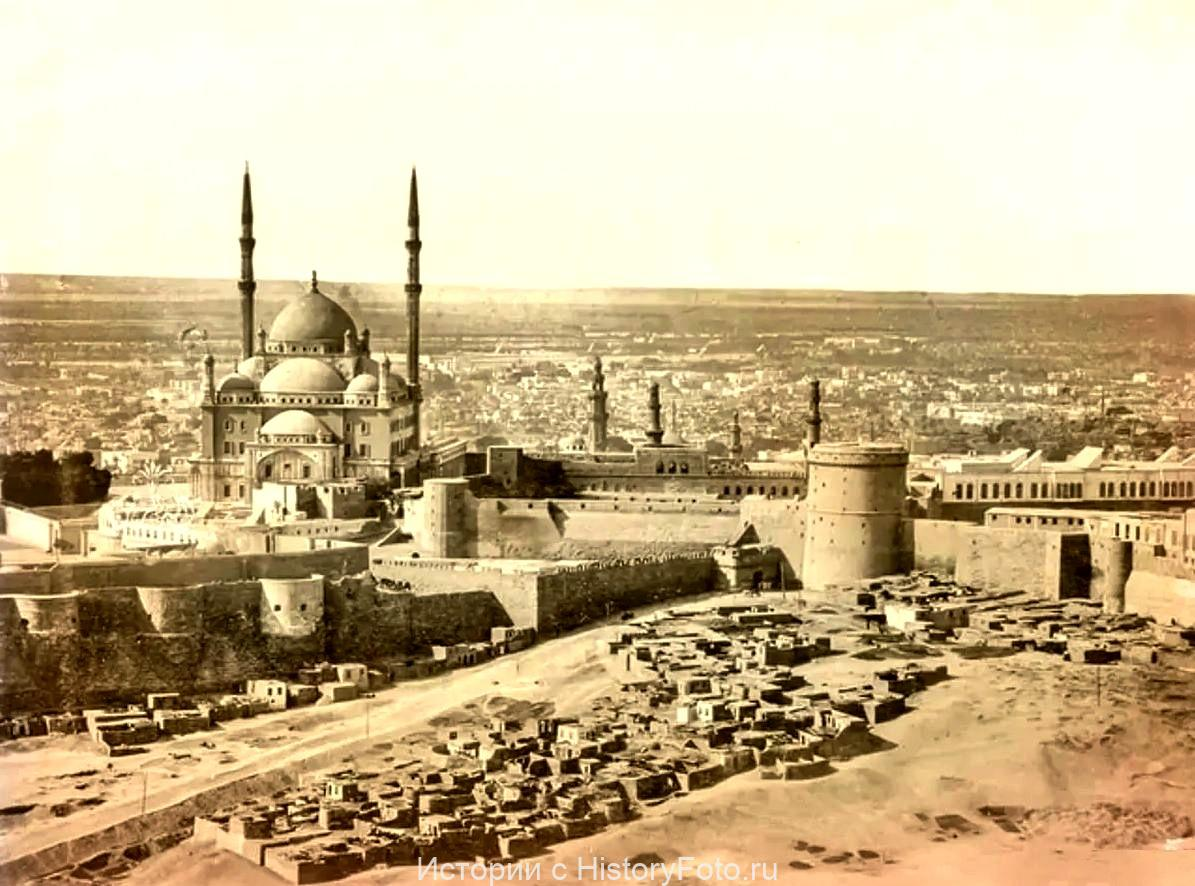 Рядом с мечетью Мухаммада Али (на фото по центру) находится еще более старая мечеть - Мечеть Мухаммада ан-Насира, построенная в 1318 году. Второе название мечети - Мечеть цитадели. Ей пользовался сам султан и его солдаты, и она была главной в Каире до того, как сюда пришли турки - Мухаммад Али Паша не стал ее реставрировать и поставил рядом свою. Каир, 1870 год.