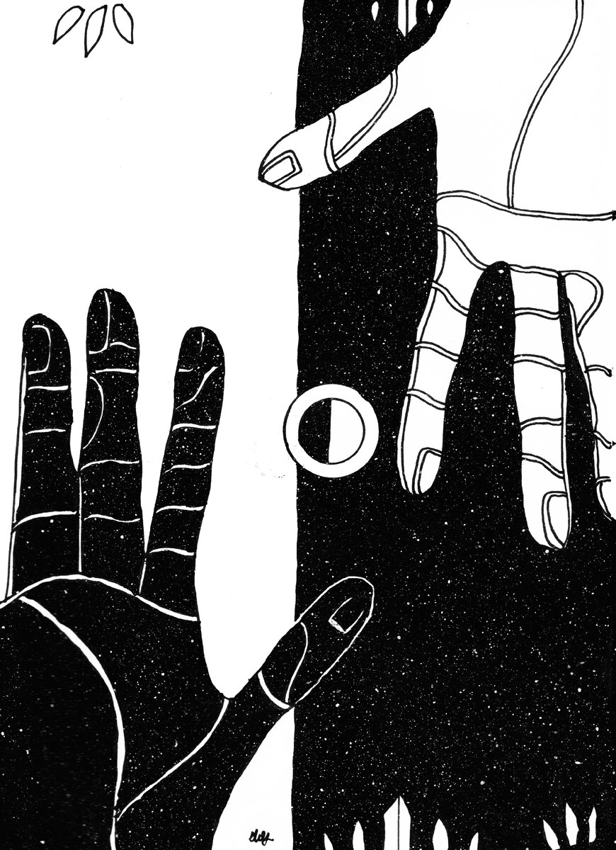 Привет! На самом деле это первая работа в скетчбуке, но написать я решила сейчас. На этой иллюстрации изображены мои руки, но только я решила сделать их образными. Да, конечно с одной стороны это очень простая иллюстрация, но она скрывает под собой следующий контекст. Это два незнакомца из параллельных Вселенных. И именно поэтому здесь снова присутствует космос. Помимо того, что это разные Вселенные ещё эту иллюстрация можно рассматривать как прошлое и настоящее, или прошлое и будущее. Чёрная рука как приглашает другую встретится в одном месте и мире. Небольшие растения здесь как декор и они не несут смысловой нагрузки. А в центре это не солнце, это кнопка, она является элементом соединения.
