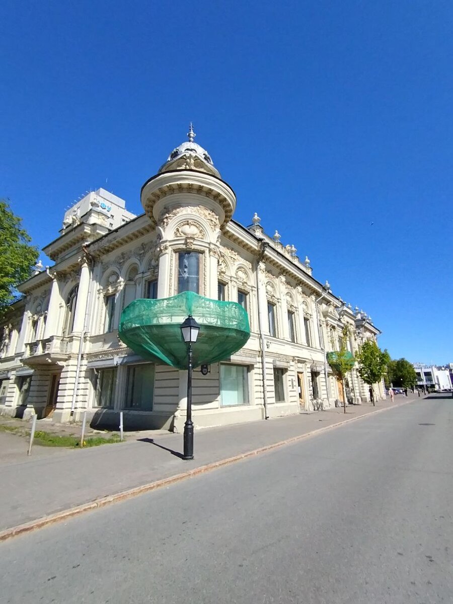В самом начале улицы располагаются университетские корпуса и очень интересное здание - дом Ушковой. Оно не зря носит имя женщины, такое все изящно-изысканное, с башенкой, кружевными балкончиками. Правда, балкончики, в том числе самый красивый, закрыты защитной сеткой, но все равно здание очень красивое.