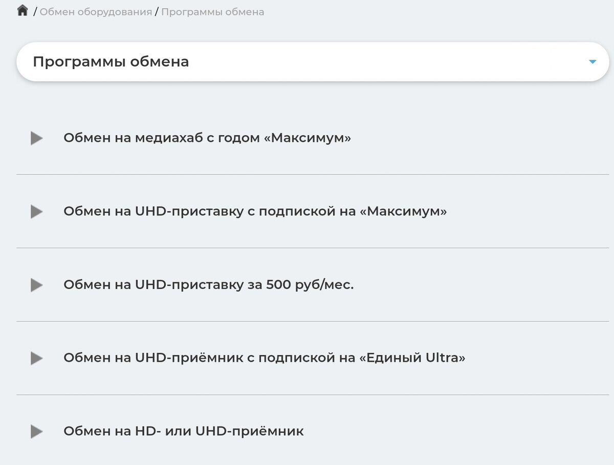 Данная статья актуальна на май 2024 года и объясняет, что делать — приобрести новый ресивер или менять старый, по какой программе. В конце 2023 года у "Триколора" были очень выгодные условия по обмену оборудования — можно было получить новый ресивер по цене подписки «Единый ULTRA HD» — 2500 рублей. А что сейчас? Скриншот с официального сайта Имеется 5 программ. Две из них с подпиской "максимум", которая в полной мере доступна на спутнике «Экспресс-АТ1», то есть если у вас тарелка настроена на «старый» спутник (европейская часть России), то вам она ни к чему. Можно посмотреть моё видео, где я объясняю, почему не стоит переходить на другой спутник: На спутнике «АМУ-1» помехи прекратились примерно в апреле 2024, только из-за них «Триколор» затеял кампанию с переходом на спутник, который всё же не предназначен для европейской части России. Итак, если всё-таки рассматривать эти два варианта, выгоднее первый, так как в 6 тысяч входит оборудование с годовой подпиской. И вообще данный вар