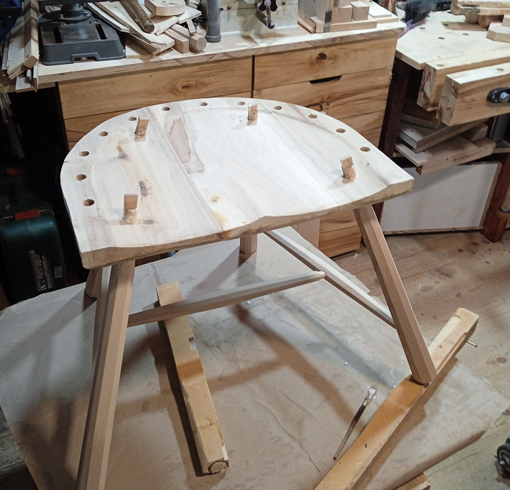 Сегодня клеил подстулье (или подкреселье? я же кресло делаю). Чтобы получилась такая красота, до склейки нужно все тщательно отшлифовать. Потому что после склейки некоторые участки шлифовать если не невозможно, то очень трудно. Сиденье снизу шлифую шлифмашинкой нождачкой 40, 120 грит. Удаляю все все линии разметки, которые были, шлифую до качества, достаточного для финишного покрытия. Ножки и проножки шлифую шлифблоками с наждачкой 120 и 220 грит. Ножки и проножки восьмиугольные, нужно пройти каждую грань. Пыли дофигища поэтому обязательно надеваю распиратор После того, как все отшлифовано, собираю подстулье насухую и отмечаю на ножках места для расклинивания. Они должны быть перпендикулярны волокну, чтобы клинья не раскололи сиденье. Опять все разбираю и делаю на ножках пропилы для клиньев Клиньев у меня заготовлено много. После этого все готовлю для склейки. Потом проверяю - все ли готово для склейки. Еще раз все проверяю. Потому что согласно первому закону Шварца, как только откры