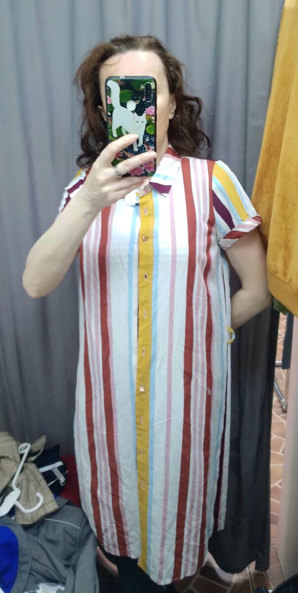 Здравствуйте, город хорошеет и обновляется. Вдоль нашего бульвара меняют бордюры, одни меняют на другие такие же. Первые пережили бы ещё атомную войну, но надо новые, мы же Москва, мы хорошеем и все это делается очень быстро. Нет не все((. Зимой у магазина стоял экскаватор над ямой, что-то потихоньку копал. На носу лето и яма на месте и экскаватор потихоньку копает. Хорошо, что ассортимент в секонде меняется не так быстро, как бордюры и не так медленно, как яма. Всё можно было купить со скидкой 80%, цены пишу полные. Хорошее прямое и длинное платье с короткими рукавами, есть шлевки, но пояса нет. Цвета хорошие, при желании не придраться. И совсем недорого. Меня остановила прозрачность ткани, полосочки от майки просвечиваются немного. Я люблю поплотнее ткань, чтобы не заморачиваться. Тенсель — это торговое название эвкалиптового волокна лиоцелла. Джемпер не чисто белый, а с добавлением светло-бежевой нитки. Приглядела его из-за отделки. Вот такие деревянные пуговицы с веревочками)) С