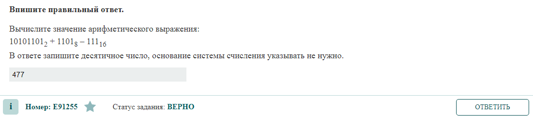 Вычислите значение арифметического выражения: 10101101₂ + 1101₈ – 111₁₆ В ответе запишите десятичное число, основание системы счисления указывать не нужно. ЧТО НУЖНО ЗНАТЬ? Правила перевода из двоичной системы счисления в десятичную Для того, чтобы перевести из 2-й в 10-ю необходимо умножить каждую цифру двоичного числа на основание “2”, возведенное в степень, равную разряду. Например, число 101₂= 1*2²+0*2¹+ 1*2⁰= 4+0+1= 5₁₀. Перевод из восьмеричной системы в десятичную Для этого необходимо умножить каждую цифру восьмеричного числа на основание «8», возведенное в степень, равную разряду числа и после этого сложить полученные результаты. Например, число 101₈= 1*8²+0*8¹+ 1*8⁰= 64+1= 65₁₀. Перевод из шестнадцатеричной системы в десятичную Для этого необходимо умножить каждую цифру шестнадцатеричного числа на основание «16», возведенное в степень, равную разряду числа и после этого сложить полученные результаты. Например, число 101₁₆= 1*16²+0*16¹+ 1*16⁰= 256+1= 257₁₀. РЕШЕНИЕ 10101101₂=1*2