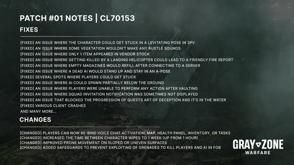 Уже седьмой фикс по счету, но до сих пор не апдейт. Мелкие правки и планы на будущее. Рассказываю. Всем, привет! Меня зовут Склерозе. Здесь я рассказываю про экстракт шутеры, на Twitch их стримлю, а в TG анонсы всего этого добра и конкурсы. Подписывайся, где удобно, если следишь за такими играми. Теперь к новости. Ребята называют это уже патчем под номером 1, но выглядит пока как большой FIX. Устранили около 200 проблем с игрой, ее стабильностью и оптимизацией. Фиксы не буду озвучивать, перечислим изменения: Планы на будущее: Продолжать улучшать игру и снимать разные технические ограничения*. Добавить смену дня и ночи на карте. Это все должно появиться в патче номер 2 Напомню, что это не классический Extract шутер, а скорее онлайн шутер с постоянной картой, по которой можно бродить до 8ми часов, насколько я знаю. Игра сбавляет обороты по активу, вышла только на ПК, сейчас находится в раннем доступе Steam. Не продается в РФ и не имеет русской локализации. На ZOG ноль русификаторов для и